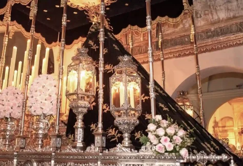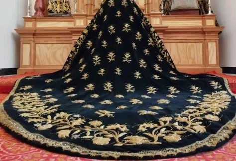 El manto de María Santísima de la Soledad presenta un doble diseño al contar con una ancha franja en las