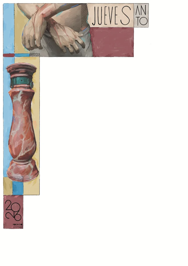 La segunda ilustración toma como protagonismo Cristo Atado a la Columna, utilizando como icono sus manos, símbolo de sufrimiento y amor por el prójimo, bajo las manos combinado con una composición moderna, geométrica y colorida esas manos son acompañadas por su Columna.